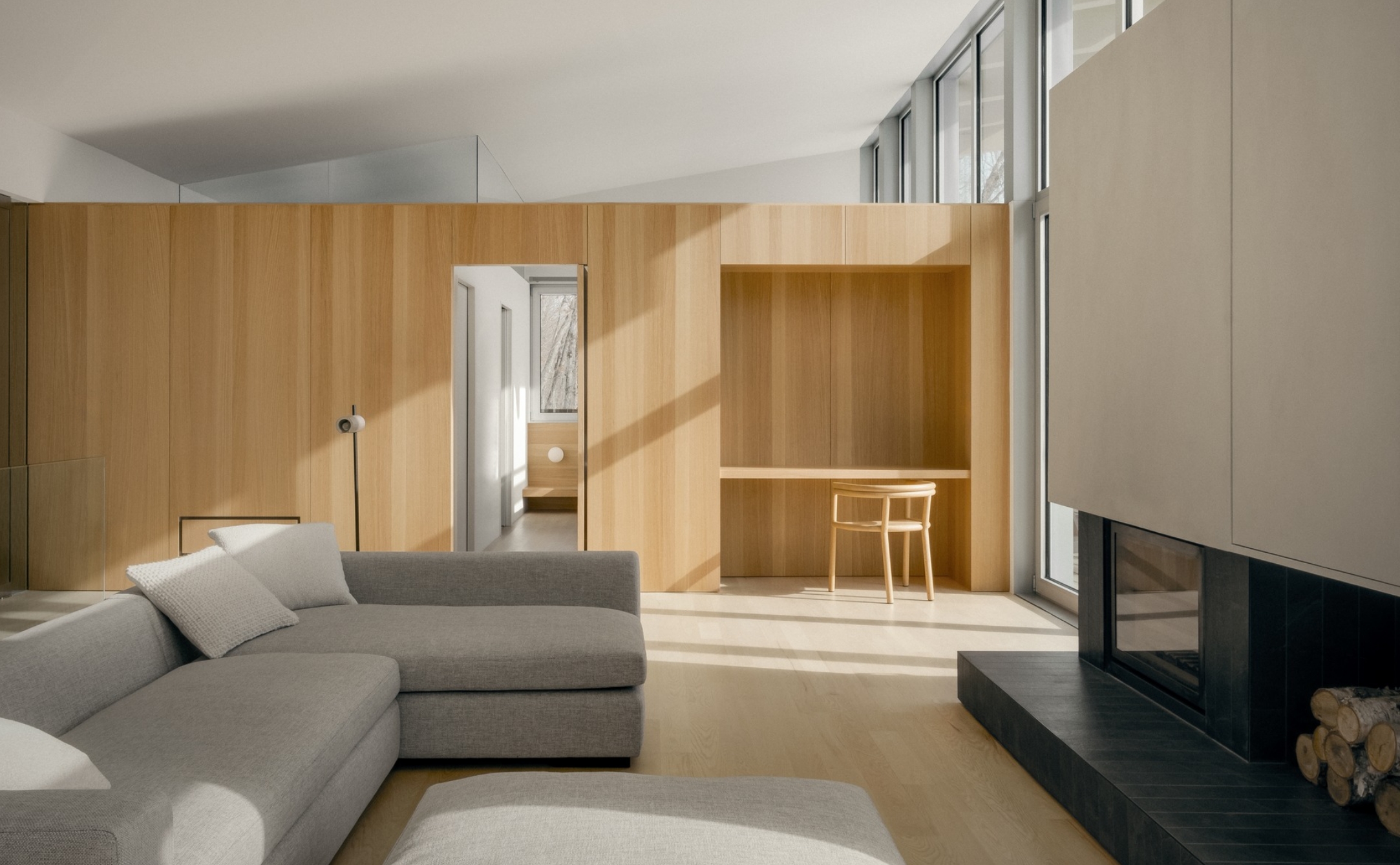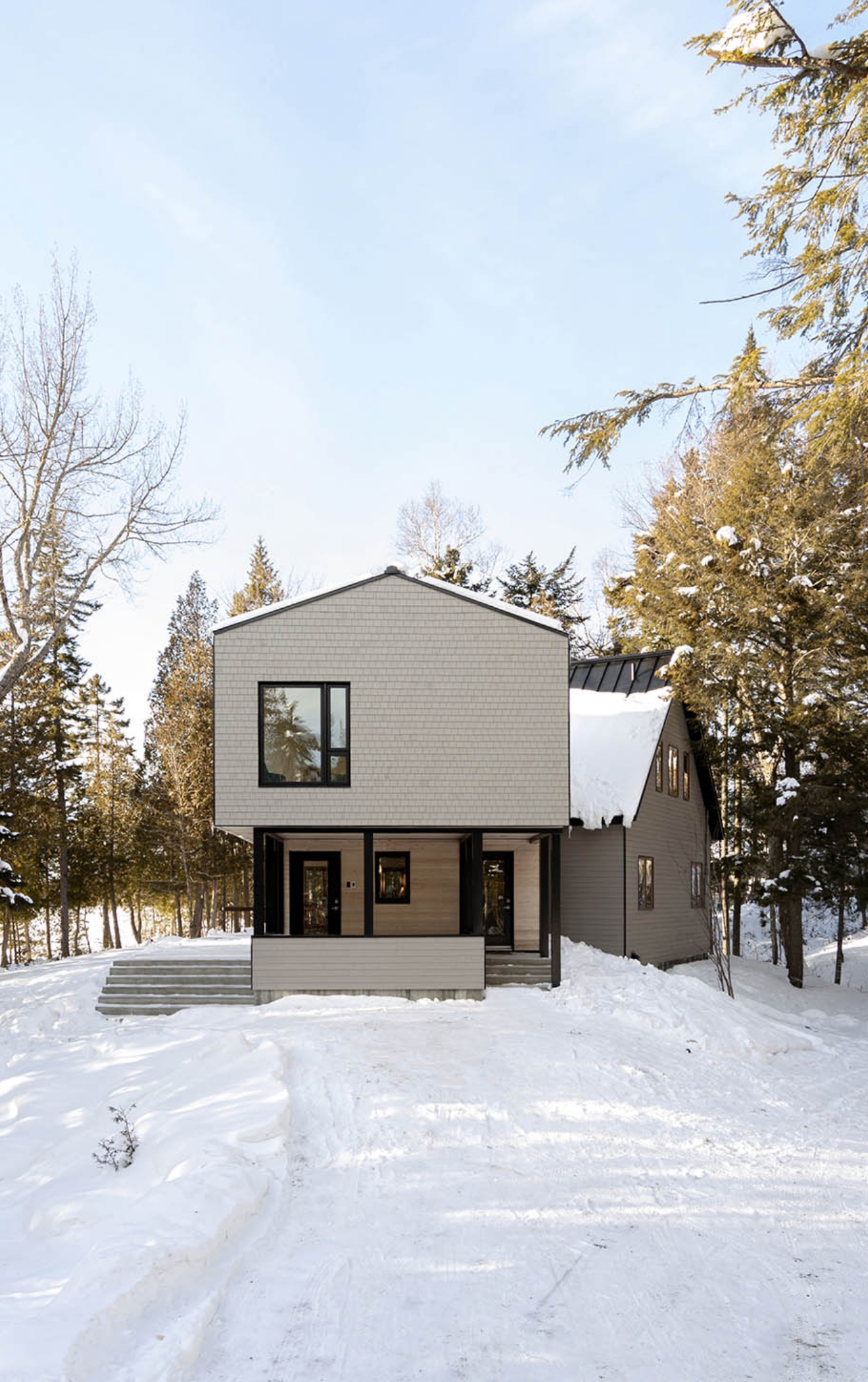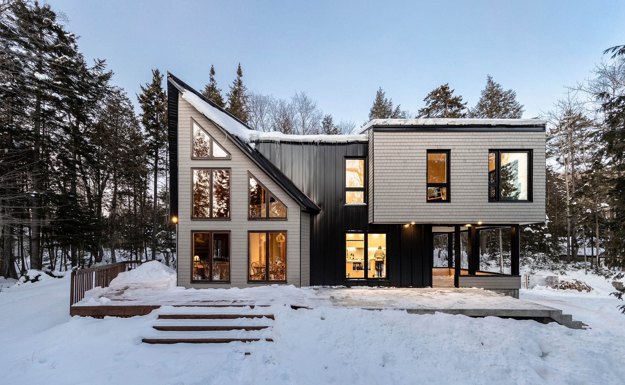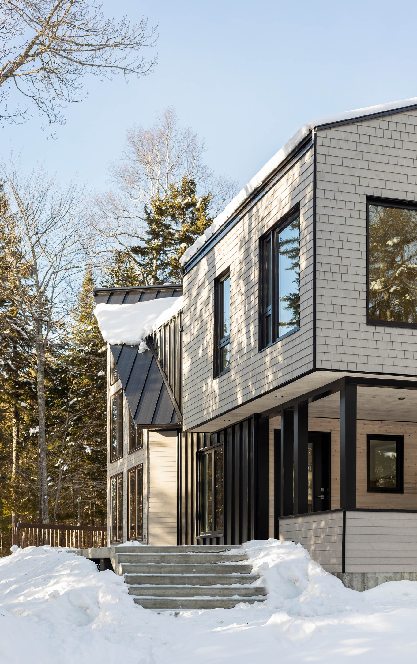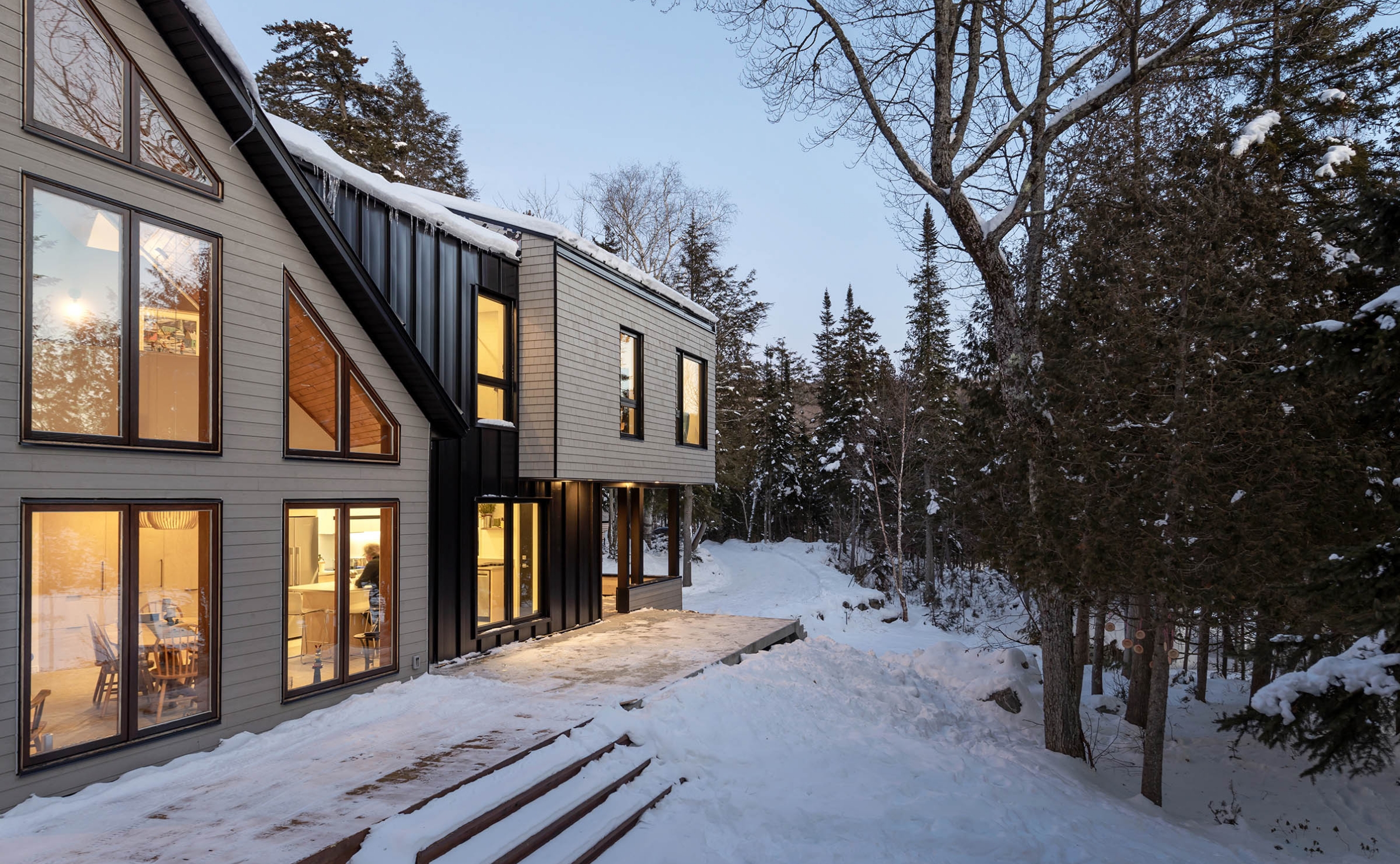 Agrandissement d’un chalet traditionnel qui fait peau neuve pour recevoir famille et amis. L’extension prend principalement la forme d’une extension sobre, revêtu d’un matériau métallique, sur laquelle vient se déposer le secteur de la chambre des maîtres telle une petite cabane suspendu.